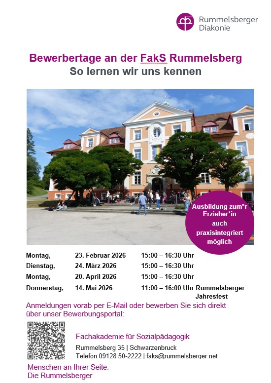 Dann kommen Sie zu unserem Bewerber- und Informationsnachmittag am Montag, 20. April 2026 um 15:00 bis ca. 16:30 Uhr in unsere Fachakademie (Rummelsberg 35, 90592 Schwarzenbruck).