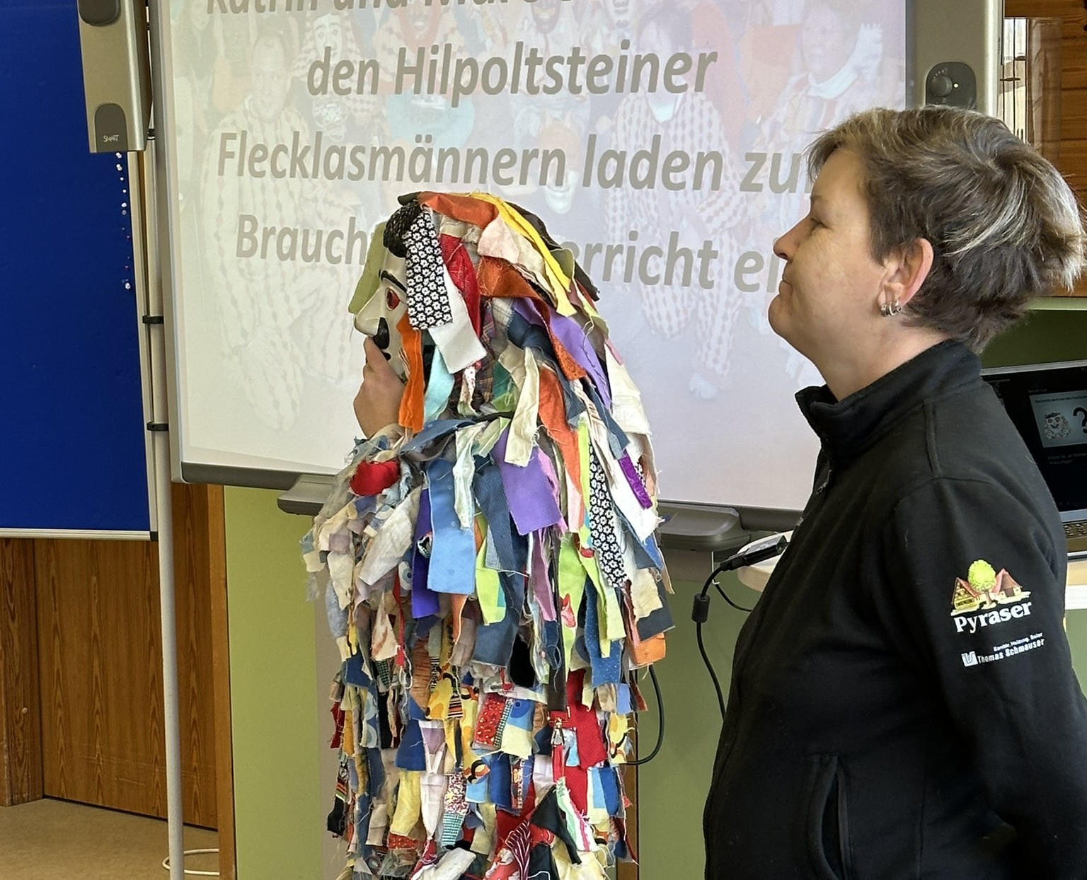 27. Januar 2026Zum wiederholten Male waren Katrin und Marc Schade von den Flecklasmännern Hilpoltstein zum Brauchtumsunterricht in der Comenius-Schule zu Gast. Sie haben wieder spannende Geschichten von der Entstehung der Bräuche in der Region erzählt.