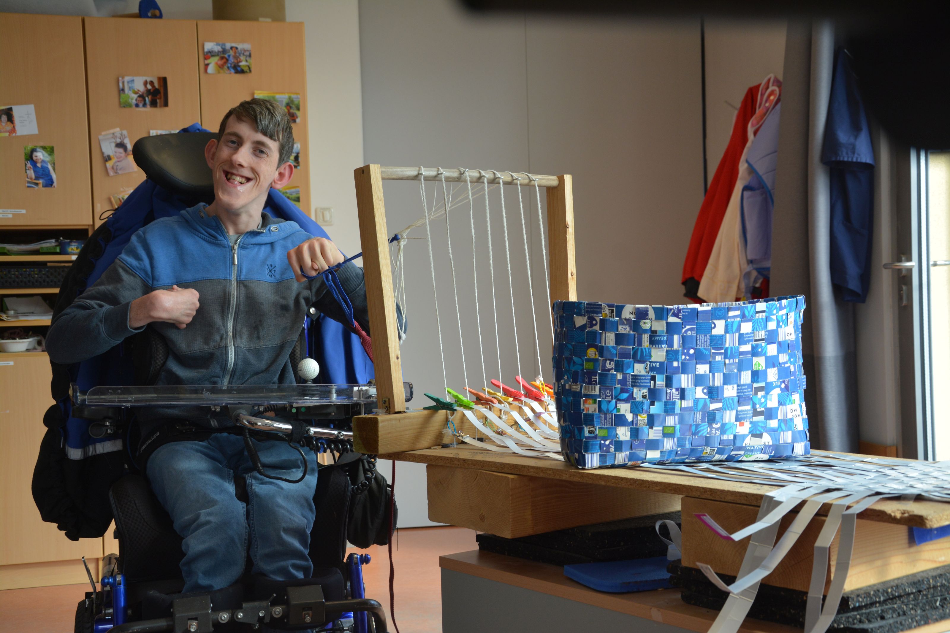 In der Förderstätte am Wichernhaus entstehen zum Beispiel handgemachte Taschen aus recyceltem Papier. Menschen mit Behinderung und Mitarbeitenden sortieren die Kartons farblich und schneidet sie in gleich breite Streifen. Anschließend flechten sie daraus an einem großen Holz-Webstuhl eine Matte. Aus ihr entsteht schließlich eine Korb-Tasche für den Verkauf. Die Arbeitsschritte und Werkzeuge sind auf die Fähigkeiten der Klient*innen angepasst. Auf diese Weise entstehen verschiedene Produkte für den Verkauf.