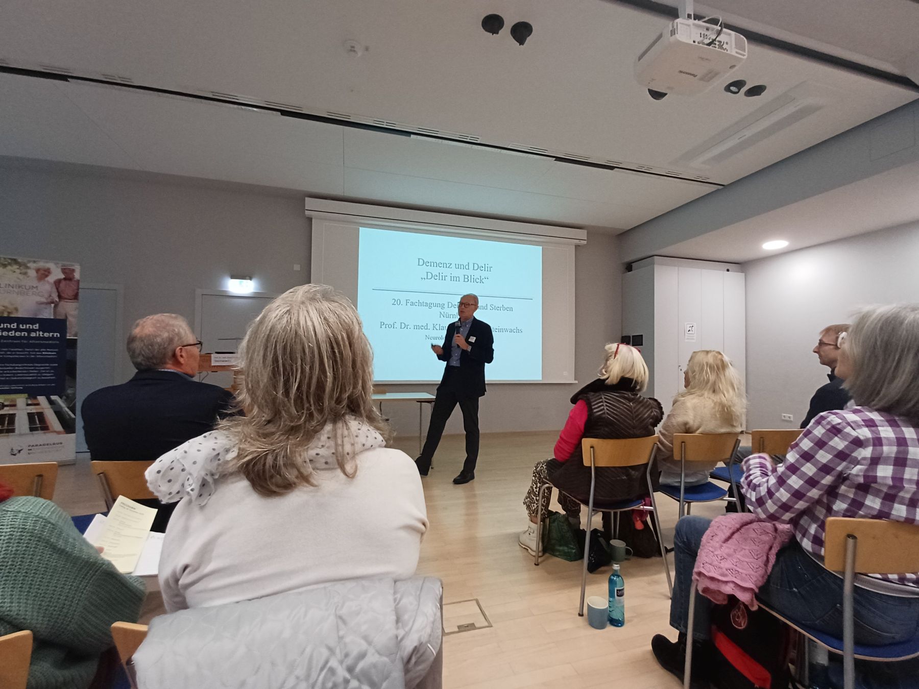 Neben der Pflegerischen Leitung Vaheri gehörte Prof. Dr. med. Klaus-Christian Steinwachs, der mit seinem Vortrag zum Thema „Demenz und Delir“ den Fachtag eröffnete. „Delir ist sehr herausfordernd für alle drei Gruppen – Angehörige, Betroffene und Pflegende“, sagt Steinwachs. „Das Delir ist etwas plötzliches“, so der Neurologe und Psychiater. Es bezeichnet akute Verwirrtheitszustände und geht einher mit verändertem Bewusstsein, gestörter Aufmerksamkeit und anderen kognitiven Störungen wie Fehlwahrnehmungen oder Beeinträchtigungen des Kurzzeitgedächtnisses. Ein Delir betriff rund zehn Prozent aller Patient*innen während eines stationären Aufenthalts. Gehäuft tritt es bei Menschen mit Demenz und ab dem 60. Lebensjahr auf.
