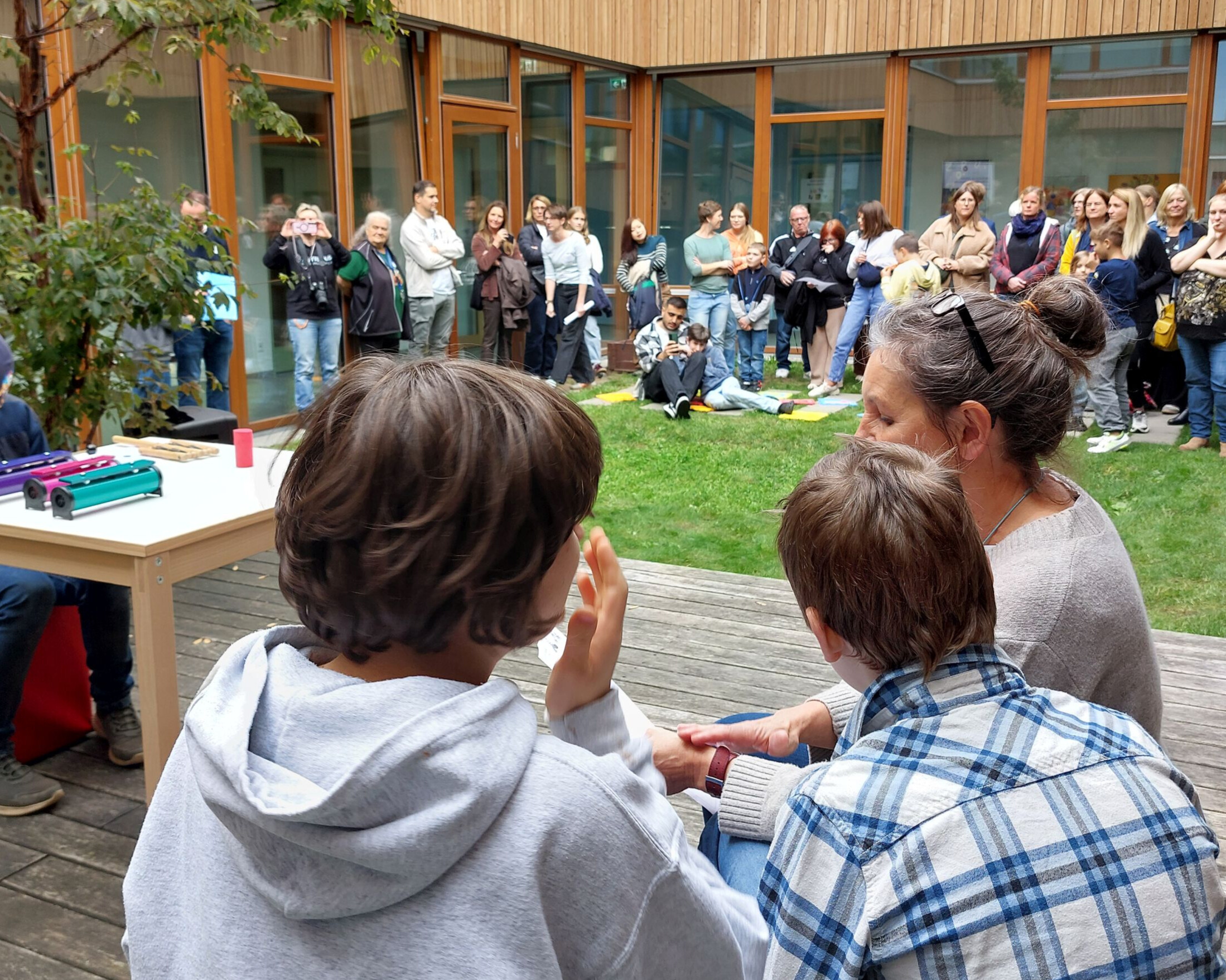 Peter Daniel Forster hob die moderne Ausrichtung der Schule hervor: „Kinder mit einem besonderen Bedarf brauchen einen besonderen Ort.“ Soziale Einrichtungen wie die Muschelkinderschule dienen keinem Selbstzweck, betonte der Politiker, sie benötigen viel mehr den Schutz vor Akteur*innen der politisch Rechten. „Unsere schöne Demokratie kann sich selbst auf demokratische Weise schnell abschaffen“, gab er zu bedenken. Am Ende seiner Rede betonte er: „Aber egal wie stark die Ränder sind – wir sind mehr.“