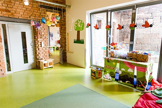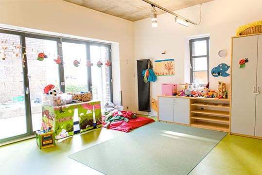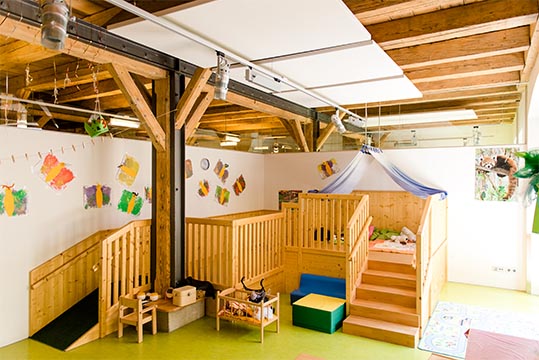 Unsere Räumlichkeiten sind alle in Anlehnung an das Konzept "Lebensräume" eingerichtet. Sie haben einen starken Aufforderungscharakter und laden Kinder und die pädagogischen Kräfte ein, aktiv zu sein. Die Spielelandschaft aus Holz wurde von der Rummelsberger Schreinerei maßangefertigt. Die Holzeinbauten schaffen mit kleinen Ecken und Nischen Platz für Rückzugsmöglichkeiten. Unsere Kinderkrippe hat zwei kleine Außenspielbereiche.