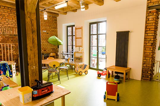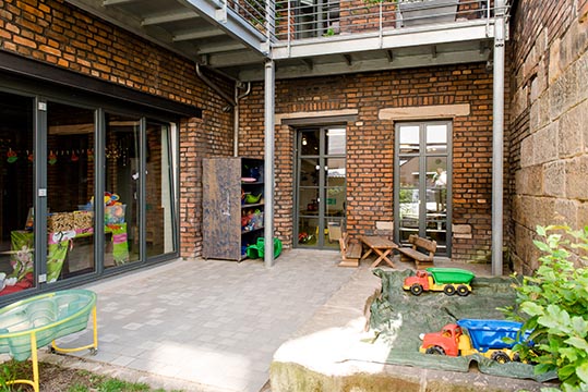 Die Kinderkrippe befindet sich in einem ehemaligen Hopfenspeicher aus dem Jahr 1883 im Herzen der Stadt Fürth und am Rande des Stadtparks, den wir mit den Kindern gerne und regelmäßig besuchen. Der Hopfenspeicher wurde mit seiner historischen Bausubstanz zu großzügigen Lofts zum Wohnen und Arbeiten umgebaut. Im Erdgeschoss befindet sich seit 2011 unsere Kinderkrippe mit zwei kleinen Außenspielbereichen.