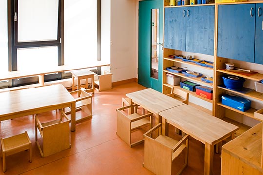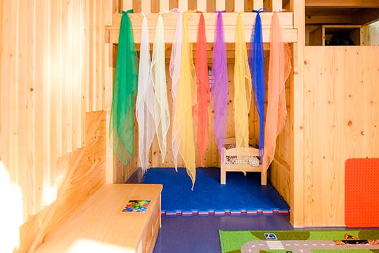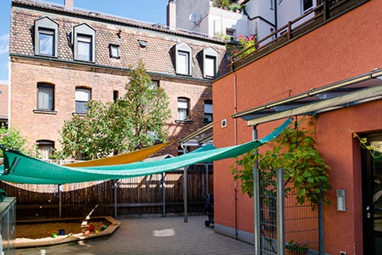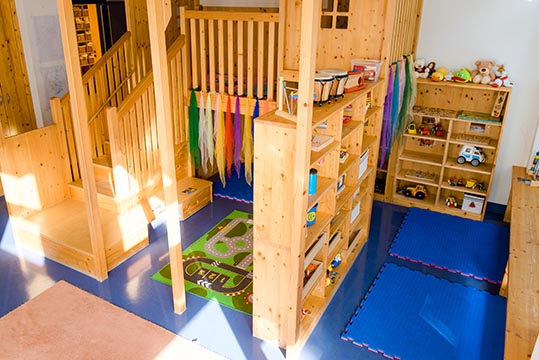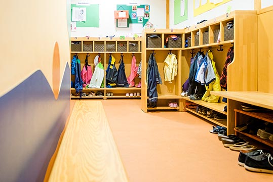 Unsere Räumlichkeiten sind alle nach dem Würzburger Modell – Bauen für Geborgenheit – eingerichtet. Sie haben einen starken Aufforderungscharakter und laden Kinder, Eltern und Erzieher*innen ein, aktiv zu sein. Bewusst ausgewählte Formen, Farben und Lichteffekte der Holzeinbauten schaffen eine „sinnliche Umgebung“ mit kleinen Ecken und Nischen für Zurückgezogenheit, aber auch ausreichend Raum für Gemeinschaft.