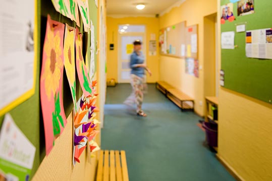 - Vorderes Haus: 4 Kindergartengruppen mit Turnhalle, Spielfluren und Nebenräumen