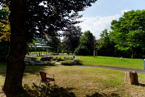 - Großer Park mit altem Baumbestand, ebenen Spazierwegen, Brunnen und seniorengerechter Schaukel