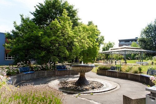 - Garten mit Brunnen, Blumenbeeten und bepflanzbarem Hochbeet im beschützenden Bereich