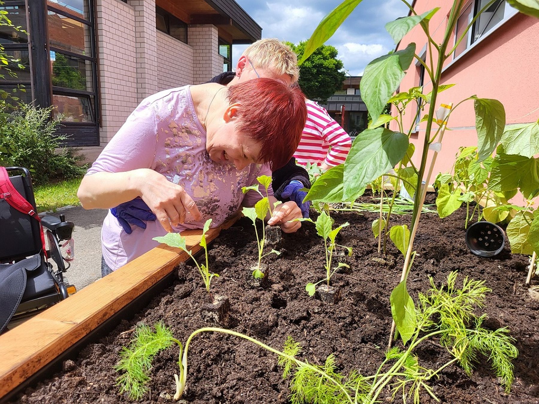 Das dafür nötige Hochbeet kam aus der hauseigenen Schreinerei, Erde und Pflanzen aus der Gärtnerei. Im Frühjahr 2024 begann das Abenteuer und die Beschäftigten pflanzten ihr Gemüse selbst an. Dann ging es an die Pflege der Setzlinge: Gurken, Tomaten, Bohnen wuchsen im Beet, genauso wie Lauch, Süßkartoffeln, Zucchini und Kohlrabi. „Alle waren mit Eifer dabei“, erzählt Claudia Bäunlein, die in ihrer Tätigkeit als Heilerziehungspflegehelferin am Projekt mitwirkte und die Beschäftigten adäquat begleitete. „Es war für alle Beteiligten eine tolle Erfahrung das Gemüse täglich wachsen und gedeihen zu sehen. Alle waren schon immer ganz gespannt, was sich zum Vortag verändert hatte. Und vor allem war es wichtig, dass jeder mit seinen Möglichkeiten an diesem tollen Projekt mitwirken konnte und seinen Teil zum Gelingen beitrug“, betont sie. Im Spätsommer 2024 zahlte sich das Heranziehen der Pflanzen dann aus. Aus der reichlichen Ernte entstanden leckere Gerichte.