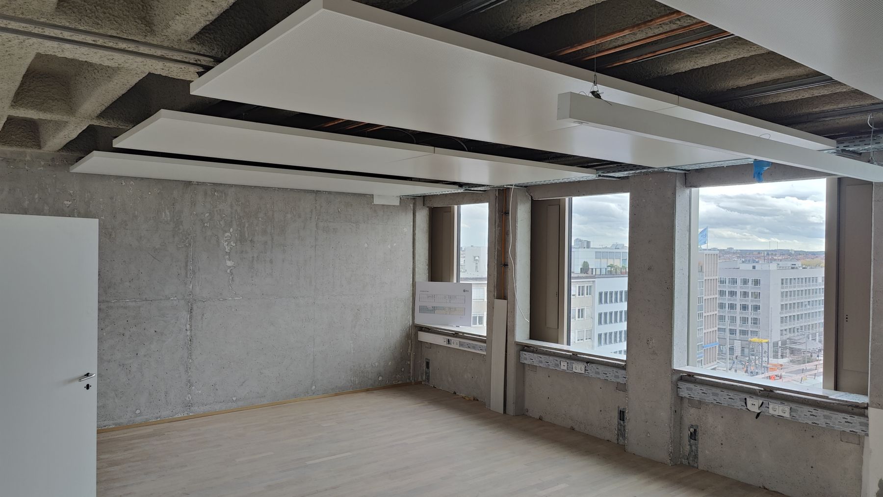 Das Gebäude wird aktuell auf höchsten energetischen und pädagogischen Standards saniert. Mit lichtdurchfluteten Räumen, großzügigen Gängen und bodentiefen Fenstern mit Blick auf den Innenhof entsteht eine Lernumgebung, die selbstverantwortliches Lernen, Kreativität und Konzentration gleichermaßen fördert. Um eine konkrete Vorstellung der zukünftigen Räume zu gewinnen, wurde bereits ein Musterraum mit Sichtbetonwänden und klaren Formen fertiggestellt, der die moderne und funktionale Ästhetik des Campus zeigt. Ein besonderes Highlight wird die Aussichtsplattform inklusive Skybar - Mitten in der Stadt und über den Dächern Nürnbergs.