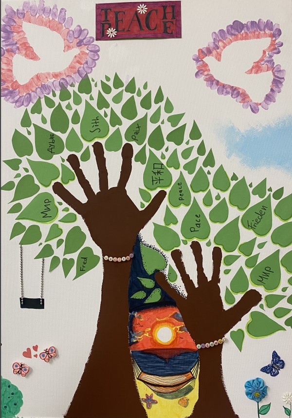 Wir haben einen Friedensbaum gemalt. Die Blätter zeigen das Wort Frieden in vielen Sprachen, weil wir alle dazugehören. Unsere Hände sind die Stämme – zusammen sind wir stark. Die Tauben stehen für den Frieden, den wir uns auf der ganzen Welt wünschen. Der Sonnenuntergang in der Mitte zeigt, wie schön die Welt ist, wenn wir freundlich zueinander sind. Für uns bedeutet Frieden: Freundschaft, Liebe und dass niemand alleine ist.