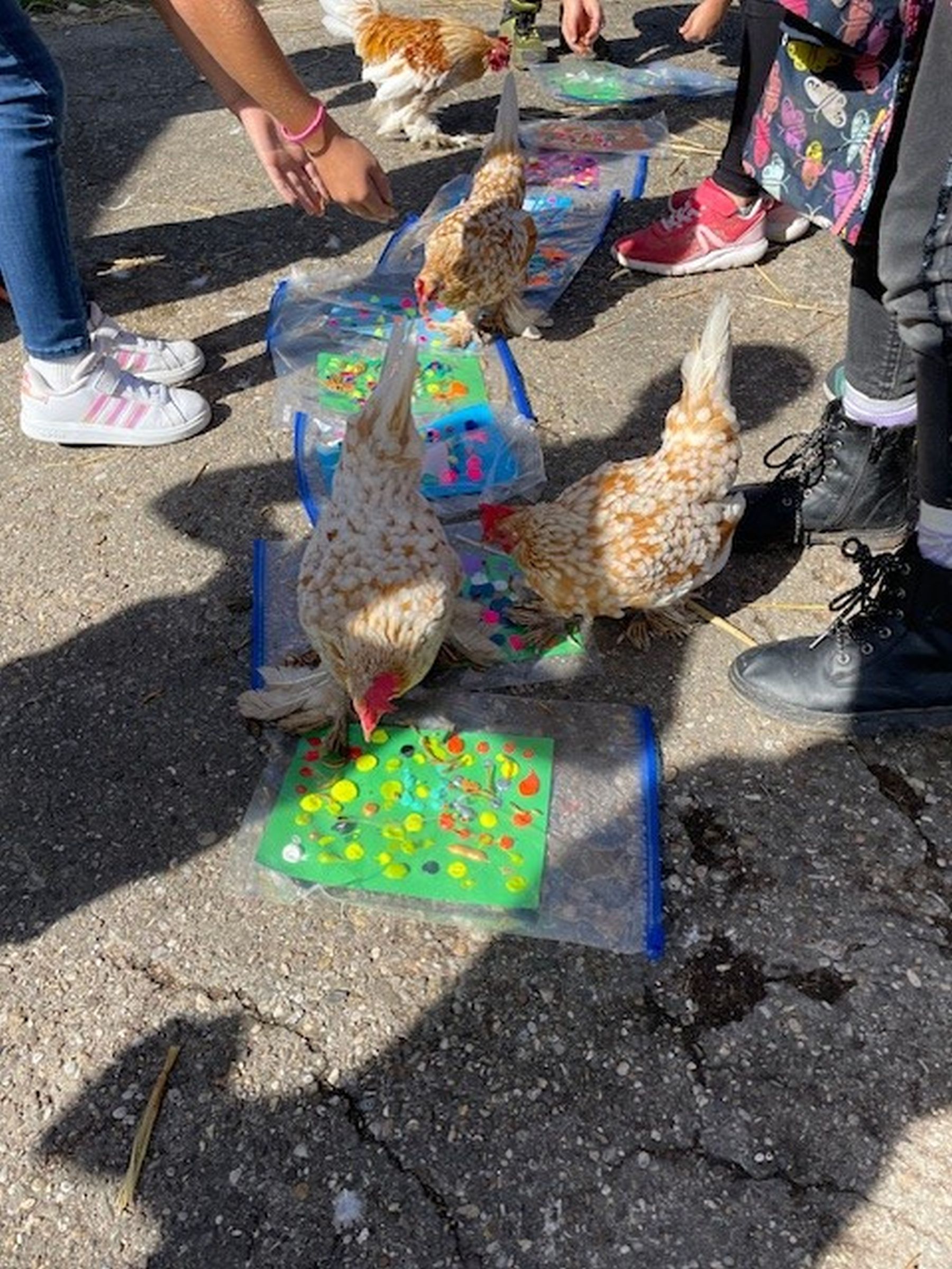 Besonders eindrucksvoll war die gemeinsame Bildgestaltung: Die Kinder verteilten wasserlösliche Acrylfarben auf Papier, legten dieses in einen Gefrierbeutel am Boden und platzierten Futter. Die Hühner liefen darüber und pickten das Futter – eine lebendige und zugleich kreative Methode, Bilder zu gestalten. Dabei kommen die Hühner auch nicht in Berührung mit den Farben. Für die jungen Teilnehmer*innen war diese Aktion ein besonderes Highlight.