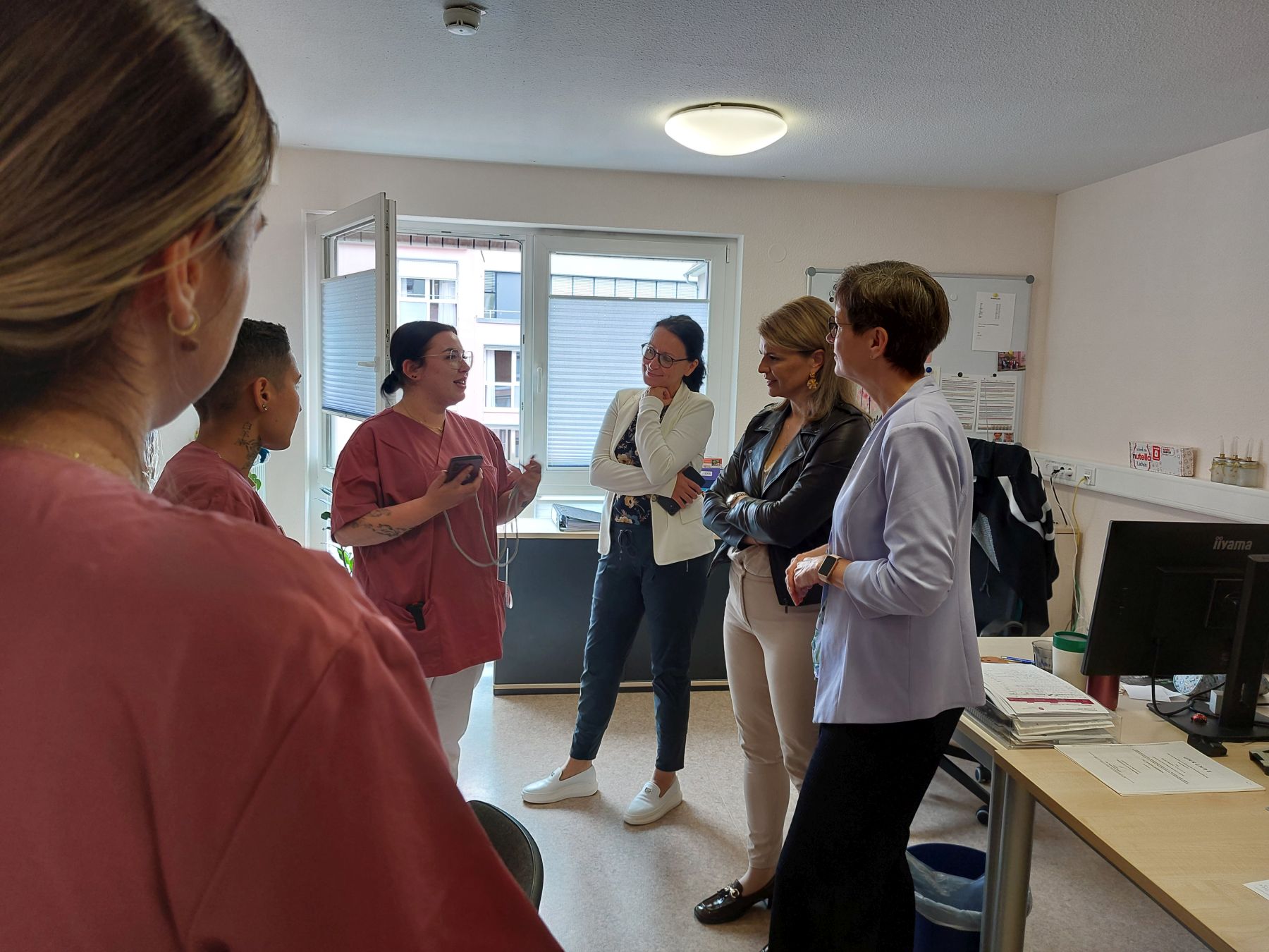 Nach einem konstruktiven und lebendigen Austausch konnte Katrin Staffler einen Einblick in die Digitalisierung der Einrichtung gewinnen. Drei Pflegefachkräfte präsentierten die neu eingeführte Spracherkennungssoftware „dexter“. Die Künstliche Intelligenz des Programms erleichtert durch Spracheingabe die Pflegedokumentation und spart somit wertvolle Zeit im Alltag der Einrichtung.