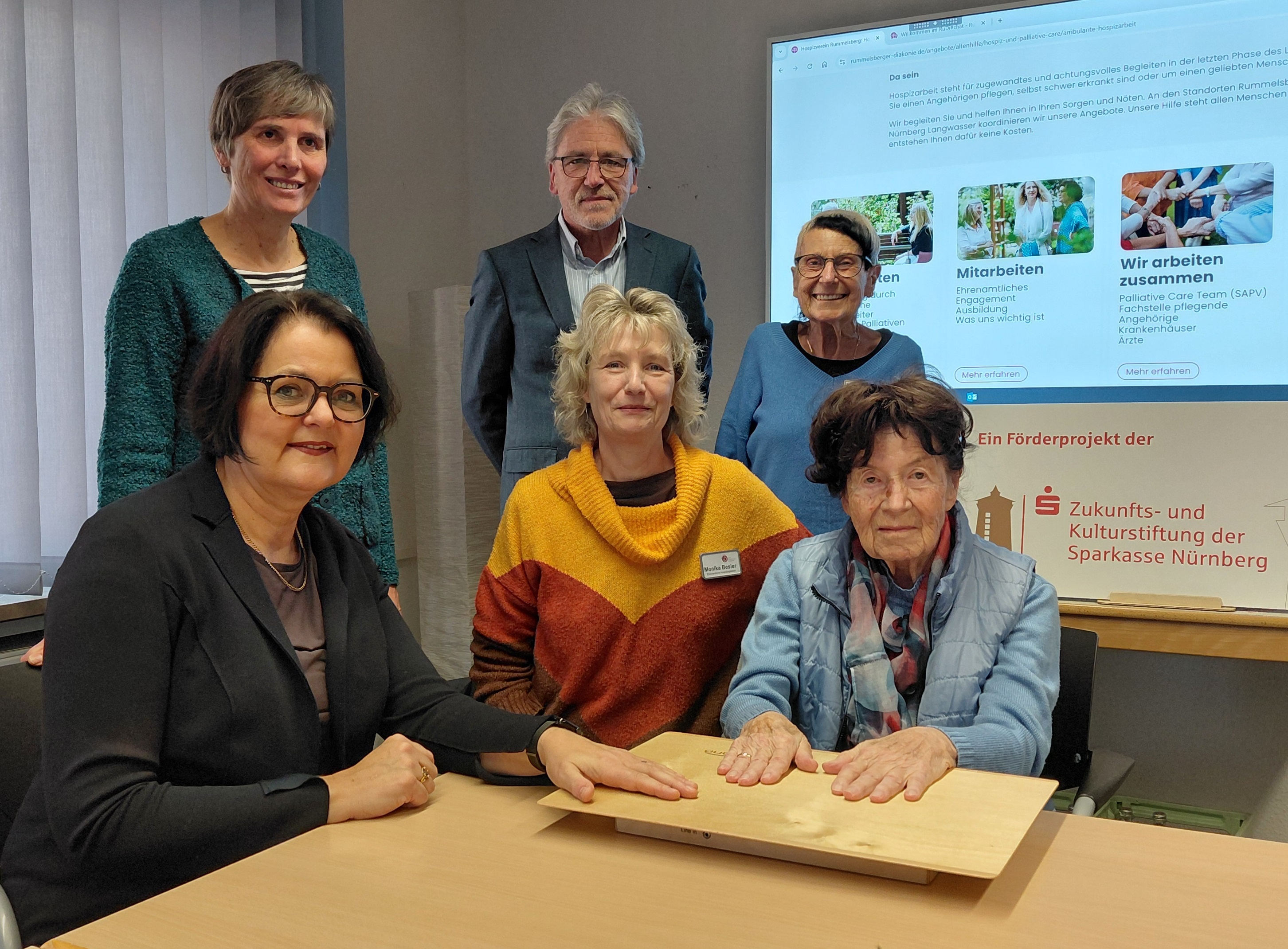 04. November 2025Zu einem erfreulichen Anlass trafen sich in den Räumen des Hospizdienstes Mitarbeitende der Rummelsberger Hospizarbeit und Bewohnerin Inge W. mit Beate Treffkorn von der Zukunfts- und Kulturstiftung der Sparkasse Nürnberg. Sie war gekommen, um an den Hospizdienst ein Resono Soundpad zu überreichen.